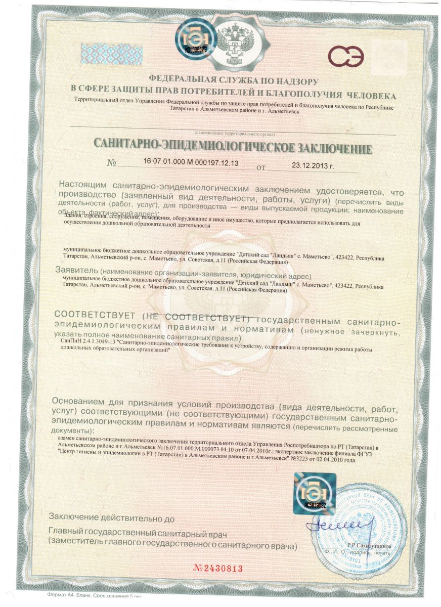 Санитарно- эпидиомологическое заключение.