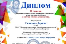 Еще одни победы в копилку нашей школы! Мы с гордостью объявляем, что получили заслуженные награды всероссийского фестиваля детско-юношеского творчества ко дню рождения, А. Л. Барто "В стране стихов Агнии Барто." Диплом 2 степени Гилязова Дарина (3 кл) Руководитель В. Я. Гиниятуллина, Диплом 2 степени Кабирова Суембика, Галимова Розалия,Исмагилова Рания (7 кл) руководитель Г. А. Ахметзянова.