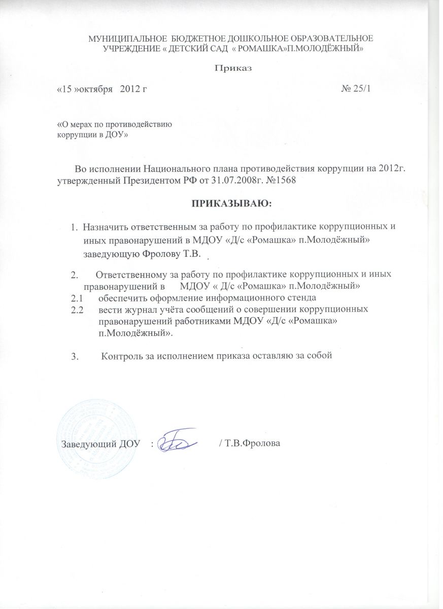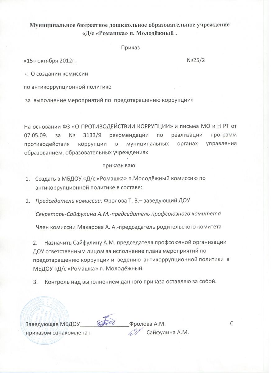 2. Приказ ДОУ " О создании антикоррупционной комиссии"
