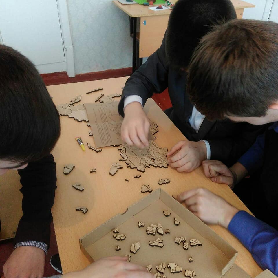 На уроке географии ученики 8 класса собрали спилс-карту Республики Татарстан и России.