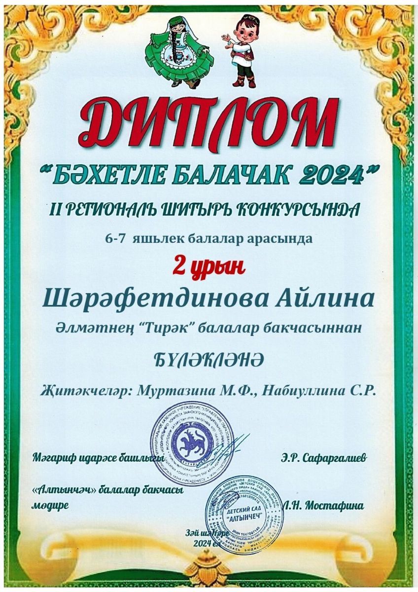 Шарафутдинова Айлинә (җитәкчеләр: Муртазина М.Ф., Набиуллина С.Р.) 6 - 7 яшьлек балаларар арасында "Бәхетле бадачак" II региональ шигырь бәйгесендә катнашып 2 урынга лаек булды. Без Айлинәне чын куңелдән котлыйбыз һәм иҗади уңышлар теләп калабыз! -