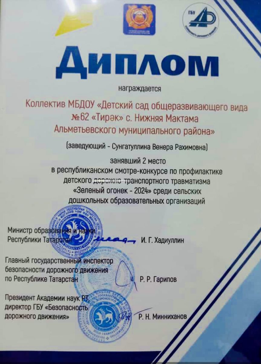 На базе МБОУ «СОШ № 25» г. Альметьевск состоялся республиканский семинар - совещание по итогам Республиканского смотра -конкурса «Зелёный огонёк». В семинаре приняли участие специалисты органов управления образования по дошкольному образованию, директор государственного бюджетного учреждения «Безопасность дорожного движения» Рифкат Минниханов, инспекторы по пропаганде БДД, начальники подразделений ГИБДД, начальники отделов и отделений профилактики территориальных управлений ГБУ «Безопасность дорожного движения».В ходе семинара был представлен опыт работы нескольких детских садов. Кроме того, в рамках семинара подвели итоги республиканского конкурса среди детских садов и воспитателей «Зелёный огонёк»Конкурс проводится раз в два года. Цель — выяснить, где детей лучше всего обучают правилам безопасного поведения на дороге. В «Зелёном огоньке — 2024» приняли участие 49 детских садов и 48 воспитателей. Победителей выбирали эксперты из Министерства образования и науки РТ, Госавтоинспекции МВД по РТ, ГБУ «Безопасность дорожного движения» и Научного центра безопасности жизнедеятельности Академии наук РТ.Среди городских детских садов: