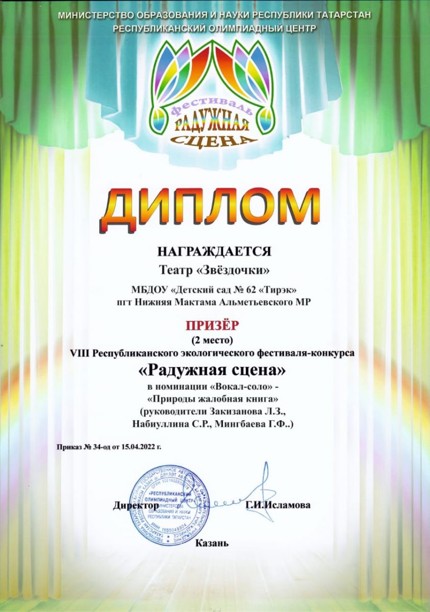 Педагоги (Набиуллина С.Р., Мингбаева Г.Ф., Закизанова Л.З.) и дети подготовительной группы "Звездочки" участвовали в VIII Республиканском экологическом фестивале - конкурсе "Радужная сцена" и стали победителями. ДИПЛОМ ПРИЗЕРА, ДИПЛОМ ПОБЕДИТЕЛЯ