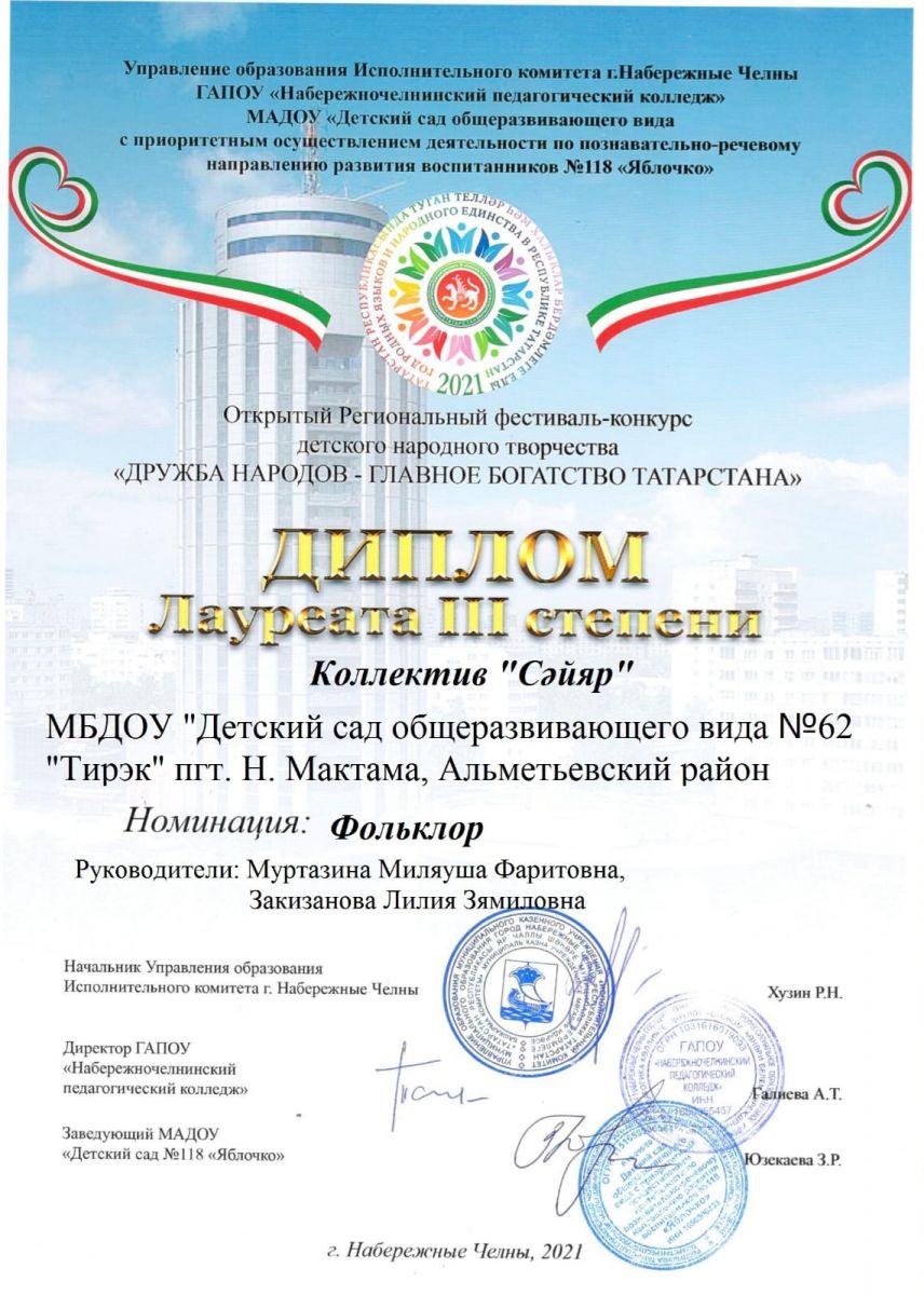 Фольклорный коллектив "Сэйяр" под руководством Закизановой Л.З., Муртазиной М.Ф. участвовали в открытом регилнальном - фестиваль конкурсе детского народного творчества "Дружба народов - главное богатство Татарстана" и стали лауреатами 3 степени. ДИПЛОМ -