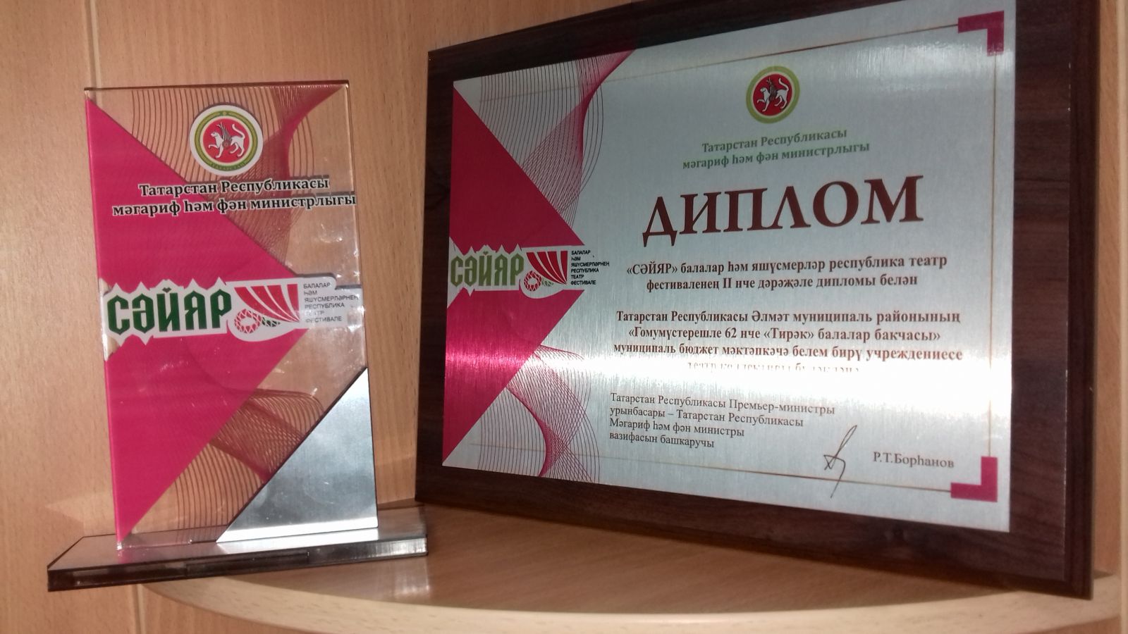 Во исполнение государственной программы «Сохранение, изучение и развитие государственных языков Республики Татарстан и других языков в Республике Татарстан на 2014-2020 годы», в целях выявления и поддержки творчески одаренных обучающихся, повышения интереса у детей к духовному наследию татарского народа, 15 декабря 2017 года в Татарском государственном театре кукол «Әкият» г. Казани состоялась торжественная церемония награждения финального этапа республиканского фестиваля детских юношеских театров «Сәйяр» с участием заместителя Премьер - министра Республики Татарстан - министра образования и науки Р.Т. Бурганова, на котором детский театральный коллектив МБДОУ «Д/с № 62 «Тирэк» награжден дипломом II степени и подарочным сертификатом.