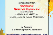 Воспитатель МБДОУ "Д/с № 62 "Тирэк" Муртазина М.Ф. участвовала в международном конкурсе "Воспитатель года по версии сайта - 2014" и заняла первое место. Спасибо за победу!