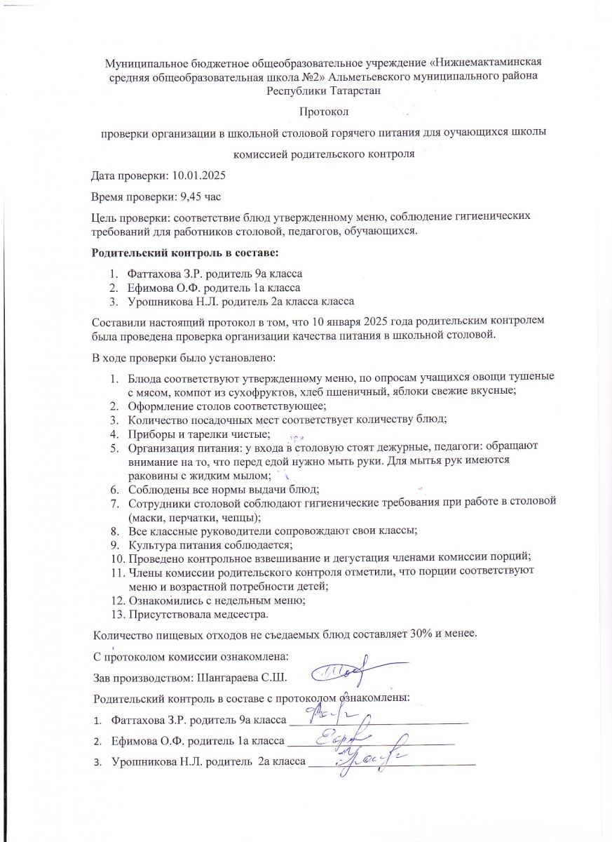 Родительский контроль за качеством питания в МБОУ СОШ в январе 2025 года