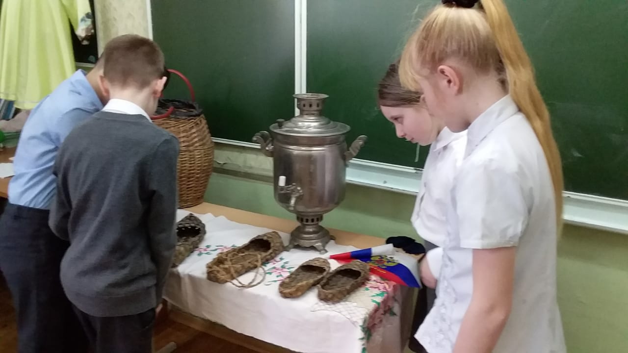 Учащиеся знакомились с материалами, которые были представлены на выставке. На выставке были и старинные русские самовары, домашний телефон, кухонная утварь, лапти и др.