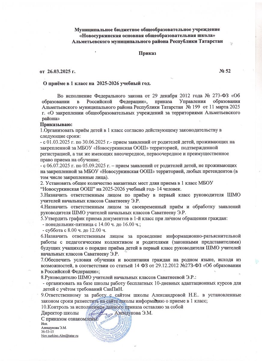 Приказ № 52 от 26.03.2025 г. "О приеме в 1 класс на 2025-2026 г"