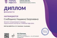 С мая 2023 г.по сентябрь 2023 г. проходил Международный конкурс педагогического мастерства "Учитель года - 2023". По результатам рейтинга наш педагог Слободина Людмила Георгиевна стала финалистом этого конкурса.