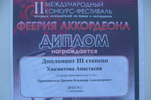 В Казани состоялся II Международный конкурс молодых исполнителей на баяне и аккордеоне «Феерия аккордеона». Учащаяся ДМШ №2 – Хикматова Анастасия приняла участие в фестивале и стала дипломантом, руководитель Еремеев Владимир Александрович