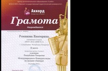 Учащаяся 3 класса нашей школы Романова Екатерина приняла участие в дистанционном Международном конкурсе конкурсе - игре по музыке "Аккорд" и заняла II место. Желаем дальнейших побед!