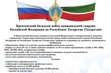 Кремлевский батальон войск национальной гвардии РФ по Татарстану проводит отбор кандидатов для прохождения службы на должность полицейского. Приглашаются граждане в возрасте от 18 до 49 лет, а также ранее проходившие службу в МО, МВД, МЧС, ФСИН, ФСБ, Пограничных войсках.