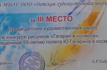 Диплом за 3 место среди детских художественных школ в городском конкурсе рисунков"Гагарин в космосе" посвященный 55-летию полета Ю.Гагарина в космос. 15.04.2016