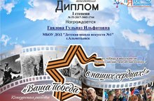 По результатам Всероссийского творческого конкурса "Ваша Победа в наших сердцах!" Гаялова Гульназ (преподаватель Чадаева С.Ю.) была награждена дипломом I степени. Поздравляем!