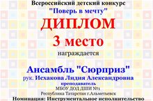 На Всероссийском детском конкурсе "Поверь в мечту" (г.Трехгорный Челябинской области), в номинации: "Инструментальное исполнительство" Ансамбль "Сюрприз" (преподаватель Исхакова Л.А.) получил 3 место. Поздравляем!