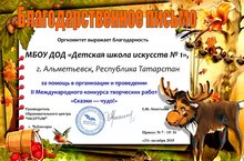 Администрация II Международного конкурса детского рисунка "СКАЗКИ-ЧУДО" выразили школе особую благодарность за помощь в организации и проведении мероприятия.