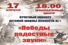 17 апреля в Молодежном центре состоялся отчетный концерт ДШИ №1, посвященный 70-летию Победы в Великой Отечественной войне. Преподаватели художественного отделения организовали выставку работ юных художников школы. В концерте прозвучали песни военных лет, музыка современных композиторов, классика, народные мелодии. Зрители горячо приветствовали юных исполнителей.