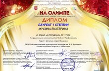 Студентка IV курса специальности "Инструментальное исполнительство.Фортепиано" Екатерина Мусина стала обладательницей звания "Лауреат 1степени" международного конкурса-фестиваля искусств "На Олимпе".