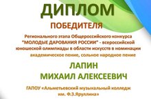Студент III курса специальности "Вокальное искусство" Михаил Лапин стал Победителем регионального этапа Общероссийского конкурса "Молодые дарования России"-всероссийской юношеской олимпиады в номинации "Академическое пение, сольное народное пение" (преподаватель, заслуженный работник культуры РТ Кашапова Раиса Равиловна)
