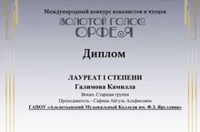 21 февраля в городе Казань состоялся Международный конкурс вокалистов и чтецов " Золотой голос Орфея". Студентки отделения "Эстрадный вокал" Галимова Камилла и