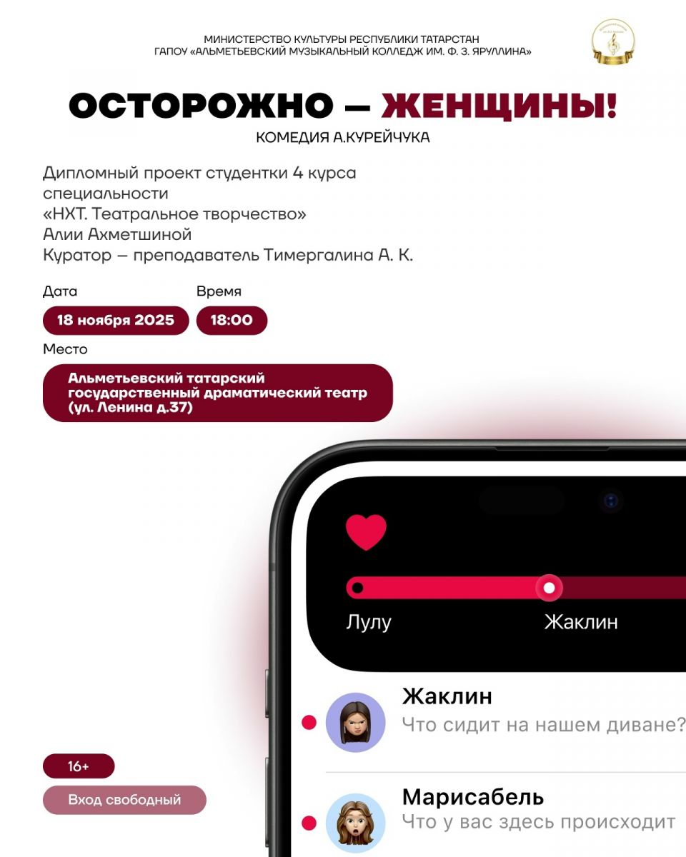 18 ноября 2025г.- дипломный спектакль студентки 4 курса специальности "НХТ.Театральное творчество" Алии Ахметшиной-комедию А.Курейчука "Осторожно-женщины!" /upload/storage/org6179/files/cTk-j7p8ZBWZipWQqLV1ZHDW9rBfbv6_HN_0-zeeRzPAbXF92LnBuIC_92Q_eakZykK2RYm3MoMrvbJ4ENFKAu1d.jpg