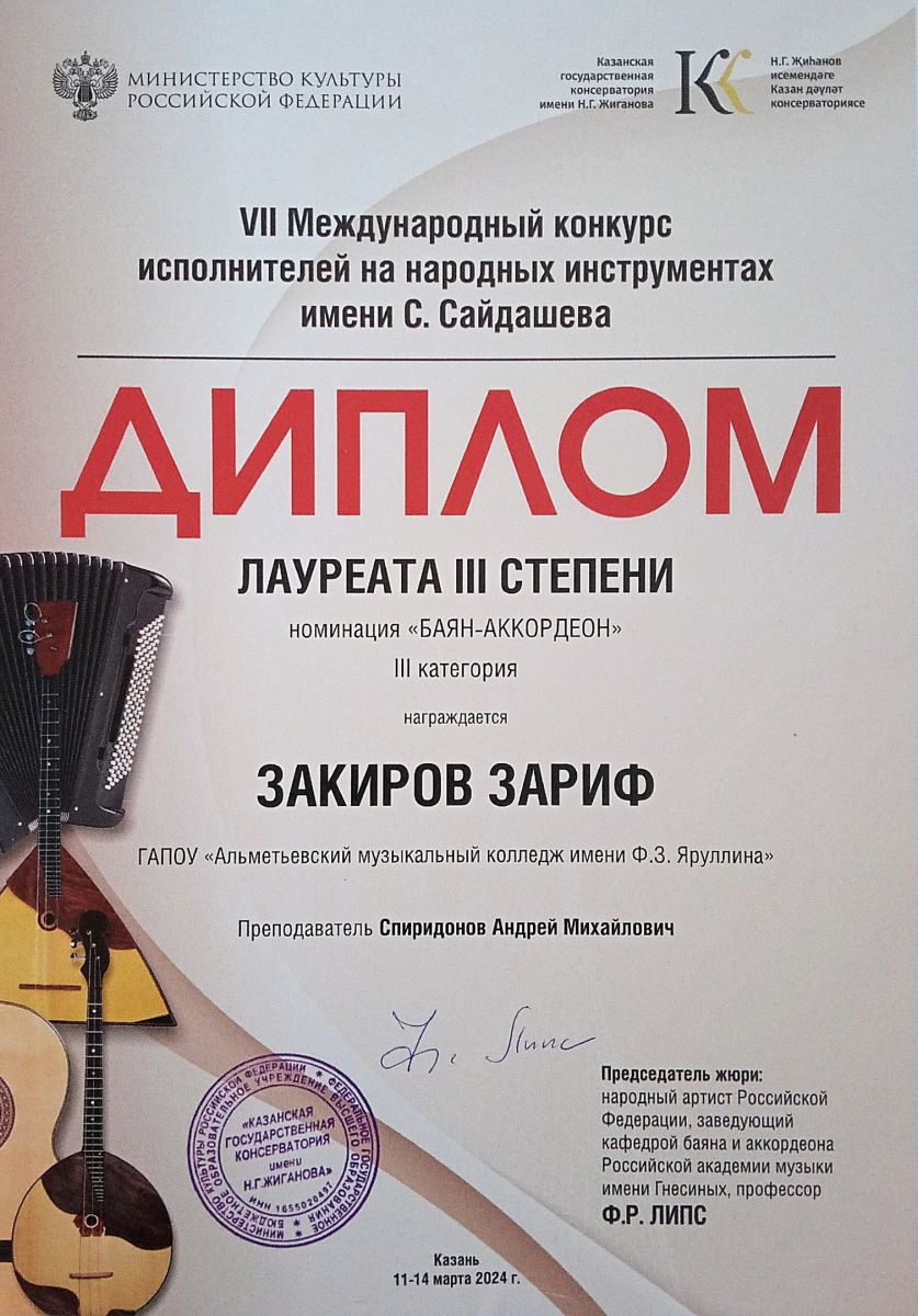 Закиров Зариф - Лауреат lll степени;
