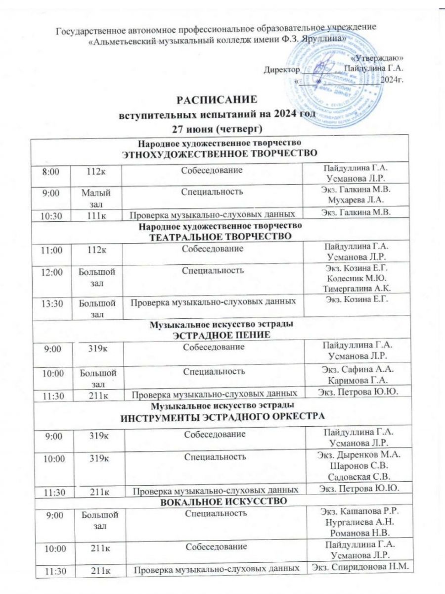 Расписание собеседований и вступительных испытаний для поступающих в Альметьевский музыкальный колледж им.Ф.З.Яруллина.