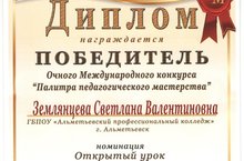 Землянцева Светлана Валентиновна - преподаватель русского языка и литературы, стала победителем очного Международного конкурса "Палитра педагогического мастерства", в номинации Открытый урок.