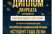 Студента АПК Клочкова Н. С. наградили дипломом лауреата в Российской национальной премии "Студент года-2016" в молодежном центре "Ак Барс" г.Казань.