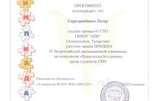 Студенты нашего колледжа Любавин С. (21 СТМ), Сиразутдинов Т. (41 СТО) удостоены звания ПРИЗЕРА IV Всероссийской дистанционной олимпиады по психологии "Психология без границ" среди студентов СПО. Руководитель Муратова Р.Г.