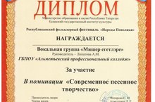 Вокальная группа "Мишэр егетлэре" награждена дипломом участника в номинации "Современное песенное творчество". Руководитель - Липатова А.М.