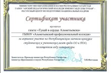 Студенты нашего колледжа Габдрахманов Р., Джураев Ш., Идрисов Р., Закирова Л., Васильев И., Ризванов Д. (руководители Рафигуллина М.М., Галиуллина Н.И., Землянцева С.В.), Осинцев Е., Хундиряков В., Мифтахов В. (руководитель Захарова З.Э.) принимали участие в Республиканском заочном конкурсе студенческих и ученических газет среди ОО и БОО, посвященных году литературы.