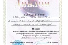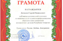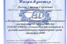 Досеев Степан (41СТО) награжден дипломом за участие в Республиканской олимпиаде профессионального мастерства по специальности 23.02.03 (190631) "Техническое обслуживание и ремонт автомобильного транспорта" среди студентов ПОО РТ. Руководитель Маслова Т.Л.