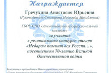 15.04.2015 г. в Альметьевском политехническом техникуме прошел конкурс чтецов "Недаром помнит вся Россия..." посвященный 70-летию Победы в ВОВ среди студентов ССУЗ юго-восточного региона РТ. Гречухина А. (21 НПК) приняла участие, и награждена дипломом участника. Руководитель Столярова Н.М.
