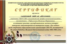 Сертификатом участника награждена Закирова Лейсан (21 СТМ) за активное участие в Республиканском заочном конкурсе авторских стихотворений на татарском языке "Эхо войны! среди студентов образовательных организаций СПО РТ, посвященном 70-летию Победы в ВОВ.