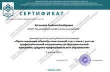 9 апреля 2024 года преподаватель английского языка Хусаинова А.И. приняла участие в республиканском семинаре "Проектирование общеобразовательной подготовки с учетом профессиональной направленности образовательной программы среднего профессионального образования"