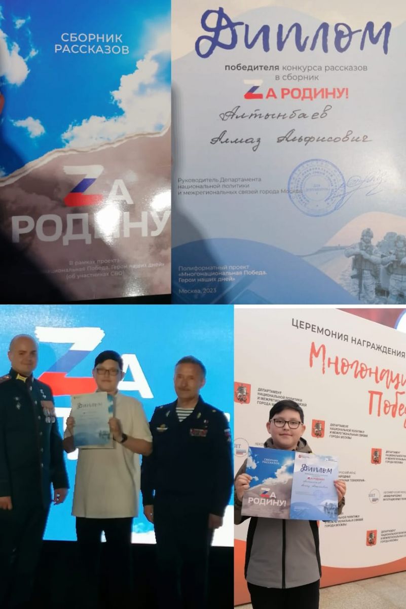 сборник «ZА РОДИНУ», посвящённый участникам специальной военной операции (СВО). Среди награждаемых ученик 7б класса МБОУ "Нижнемактаминская СОШ 1" Алтынбаев Алмаз (учитель Закиржонова Г.Н.). Героем для мальчика является старший брат Измайлов Айрат, добровольно решивший встать на защиту Родины, и именно ему посвящён рассказ, который вошел в сборник. Именной диплом и полный сборник рассказов Алмаз получил из рук Героев России, проявивших мужество и героизм в военном деле.#годпедагогаинаставника