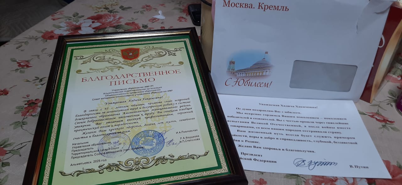 Опубликовано: 09.01.20259 января 2025 года Управление образования Альметьевского муниципального района приняло участие в поздравлении с 95-летним юбилеем Ахметзяновой Хадичи Хакимовны, труженика тыла, вдовы участника Великой Отечественной войны и ветерана детского сада №9 «Садко»