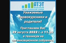 Приглашаем Вас 29 августа 2022 г. в 11.00 часов в техникум на организационное собрание.