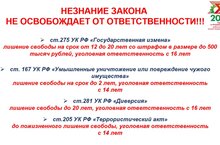 Незнание законов не освобождает от ответственности:- ст. 275 УК РФ «Государственная измена» лишение свободы на срок от 12 до 20 лет со штрафом в размере до 500 тысяч рублей, уголовнаяответственность с 16 лет.- ст. 167 УК РФ «Умышленные уничтожение или повреждение чужого имущества» лишение свободы на срок до 2 лет, уголовная ответственность с 14 лет.- ст.281 УК РФ «Диверсия» лишение свободы до 20 лет, уголовная ответственность с 16 лет.