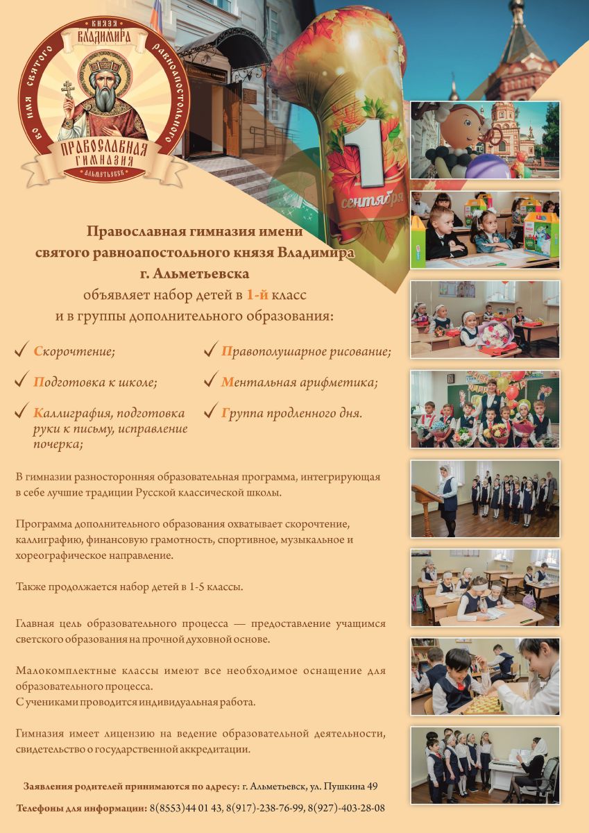 В Православную гимназию имени святого равноапостольного князя Владимира г.Альметьевска объявляет набор детей в 1 - й класс и в группы дополнительного образования. Также продолжается набор детей в 1-5 классы!