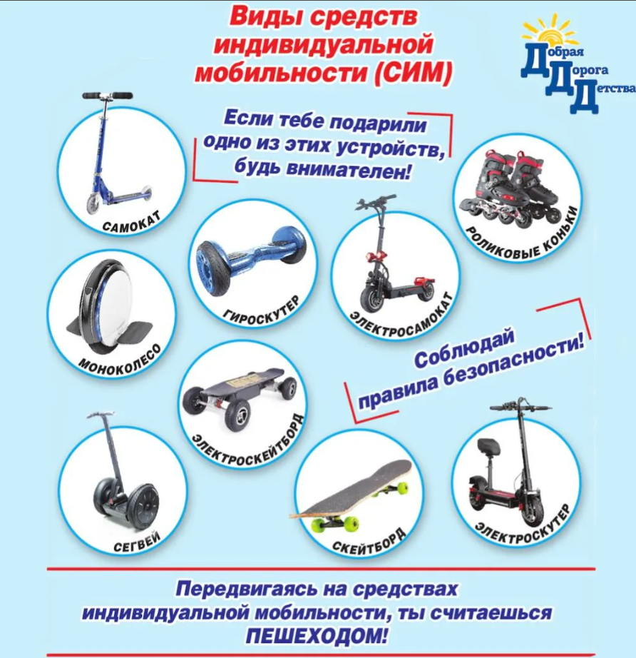 Опубликовано: 25.05.2023Средство индивидуальной мобильности (СИМ) - транспортное средство, имеющее одно или несколько колес (роликов), предназначенное для индивидуального передвижения человека посредством использования двигателя (двигателей) (электросамокаты, электроскейтборды, гироскутеры, сигвеи, моноколеса и иные аналогичные средства).