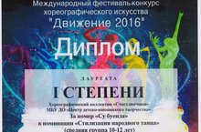 Поздравляем руководителя хореографического коллектива "Счастливчики" Хайдарову Оксану Фатиховну и ее воспитанников с победой в Международном фестивале-конкурсе хореографическо искусства "Движение 2016", за номер "Су буенда" в номинации "Стилизация народного танца" (средняя группа 10-12 лет);