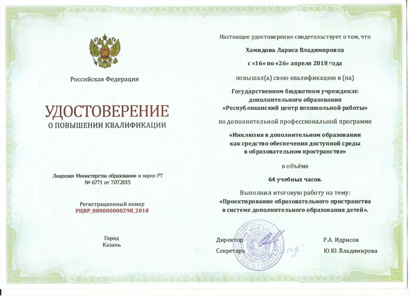 Хамидова Л.В. "Инклюзия в дополнительном образовании как средство обеспечения доступной среды в образовательном пространстве"