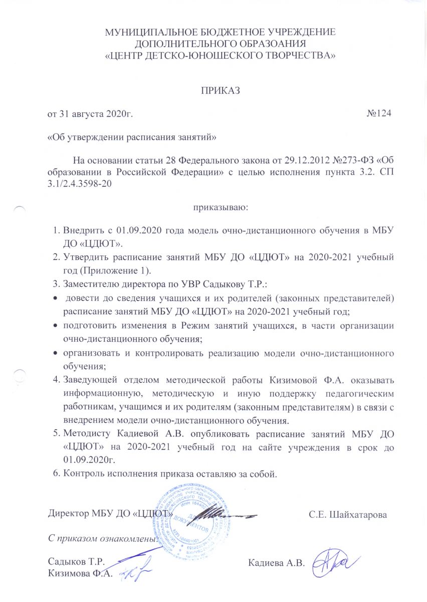 Приказ об организации модели очно-дистанционного обучения в МБУ ДО "ЦДЮТ"