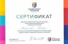 Поздравляем победителя Открытого конкурса соорганизаторов мероприятий Университета Талантов педагога дополнительного образования объединения "Робототехника и техническая кибернетика" Максутова Артура Альбертовича, который получил сертификат на получение комплекта оборудования для реализации сетевого проекта "Чемпионат научных состязаний".