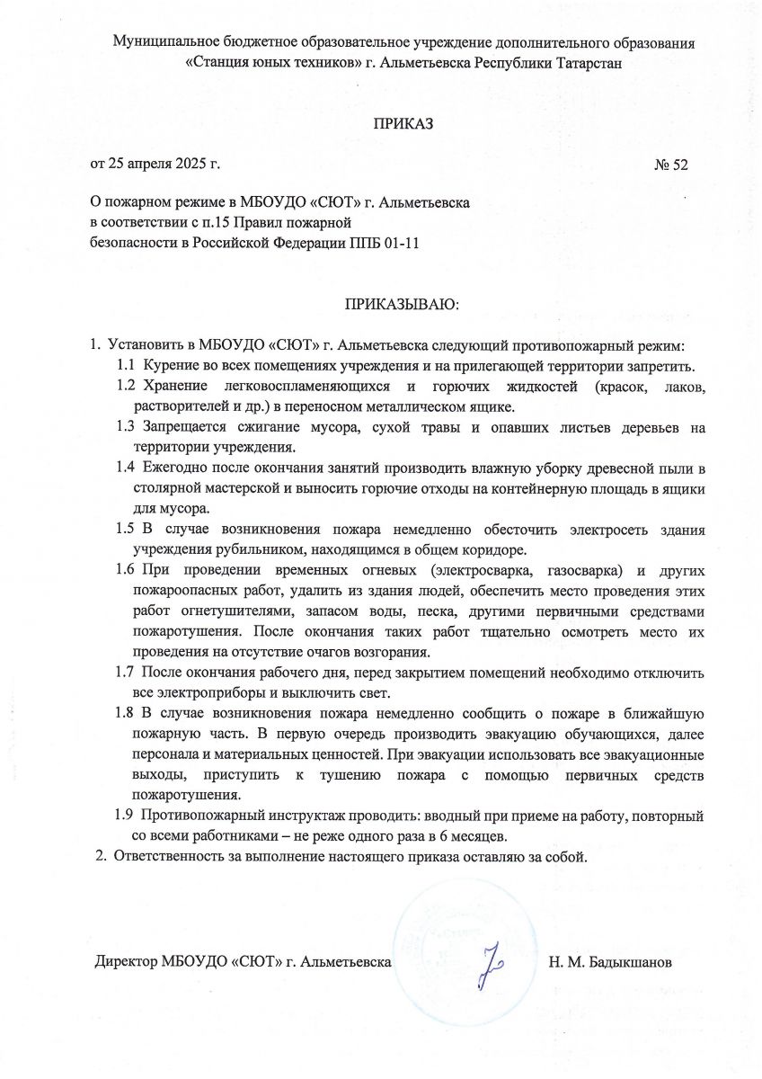 Приказ о пожарном режиме в МБОУДО "СЮТ" г. Альметьевска
