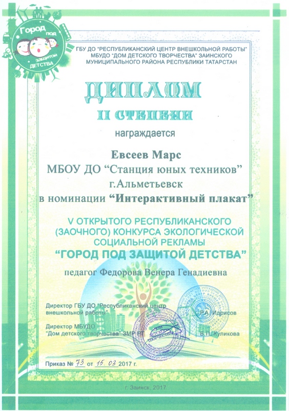 Опубликовано: 01.03.2017Учащиеся объединений «Забава» - Фарухшина Эвелина (педагог дополнительного образования – Фарухшина Евгения Сергеевна) и «Город мастеров» - Евсеев Марс (педагог дополнительного образования Федорова Венера Генадиевна) приняли участие в V открытом республиканском (заочном) конкурсе социальной экологической рекламы «Город под защитой детства» на базе МБУДО «Дом детского творчества» Заинского муниципального района РТ с 16 января по 28 февраля 2017 года.