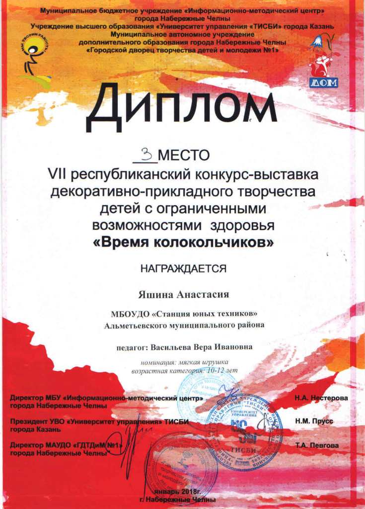 Опубликовано: 26.01.2018С 15 декабря 2017 года по 23 января 2018 года в выставочном зале Дворца «Синяя птица» г. Набережные Челны прошёл VII республиканский конкурс-выставка декоративно-прикладного творчества детей с ограниченными возможностями здоровья «Время колокольчиков» и II республиканский конкурс для педагогов дополнительного образования социально-педагогической направленности, занимающихся с детьми с ОВЗ «Мастерская творчества, идей и вдохновения». Активное участие приняли учащиеся объединения «Юные кудесники» - Данданова Татьяна и Яшина Анастасия, а также их педагог дополнительного образования – Васильева Вера Ивановна.